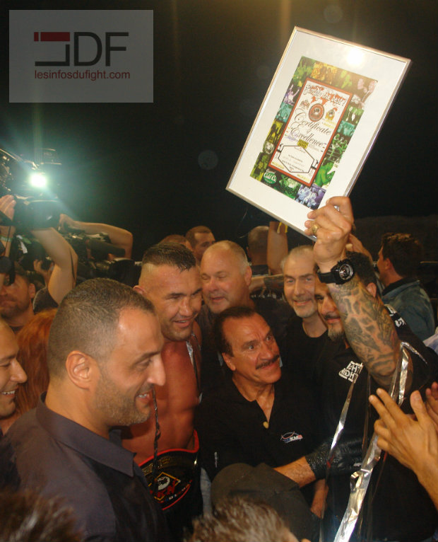Et puis Robertson les a envoyé comme il faut, secouant son adversaire à 2 reprises. Que dire de ce premier voyage au tapis du Normand le premier surpris après l’arbitre qui en oubliera de compter JLB. Le deuxième est le bon ; Jérôme est down à nouveau et seule l’indiscipline de l’américain lui permet de récupérer. La règle stipule bien que l’arbitre doit commencer à compter quand l’adversaire est dans le coin neutre. C’est indéniablement le tournant du match. Le normand va de surcroît usé du low kick (l’américain s’en sort avec un gros hématome sur la cuisse) et obligé l’arbitre à de nouveau mais cette fois Karl Robertson qui ne s’est pas plaint d’une frappe dans la coquille comme évoquée parfois. Finalement, les deux hommes vont se neutralisés peu à peu jusqu’au coup de gong finale, laissant aux juges le soin de donner le verdict. Il ira en faveur du français qui met du temps à savourer mais surtout à comprendre que c’est fini. Il laisse exulté sa joie ; pas celle du vainqueur d’un championnat du Monde WKN mais celle de l’homme libéré de cette pression qui pesait depuis des mois. Jérôme Le Banner a raccroché les gants le 4 août 2015 23 ans après avoir débuté entre les cordes. Cette ultime sortie faite devant Brice Guidon, René Pollet, Philippe Gomis et les autres mais aussi de sa femme Mélissa, cette sortie disais-je clos son histoire pugilistique même si nous pouvons le dire, nous n’avons pas fini d’entendre parler de Jérôme Le Banner !
