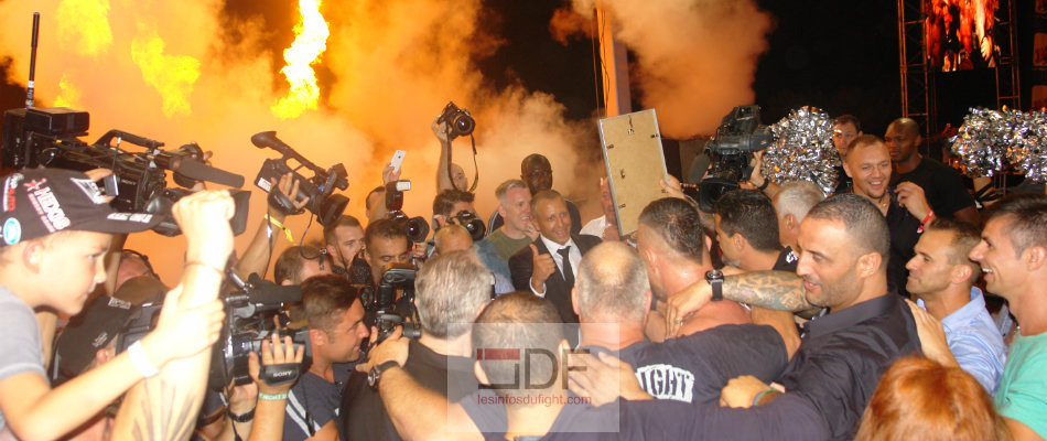 Qu’elle était belle cette Citadelle de Saint Tropez le soir du 4 août ! La pesée avait été magique devant environ 500 personnes venus saluer une dernière fois un monstre sacré et en découvrir un autre. Car finalement la symbolique est bel et bien là : Jérôme Le Banner a transmis le flambeau de la notoriété à Yohan Lidon qui a enflammé le public durant deux jours. Et quel public ! Ils étaient venus en nombre assister à ses adieux particuliers d’un champion au ring : Gérard Lanvin, Clovis Cornillac, Joey Starr, Enrico Macias, Thomas Langman, Vincent Lagaff, Jean Michel Aulas, Jean Roch, David Ginola et bien d’autres donnaient un petit de coup de nostalgie des grandes soirées de l’époque sous l’ère Samy Kebchy. Saint Tropez était prête pour ce qui allait être une véritable communion entre spectateurs et acteurs d’un troisième opus où les talents s’en sont allés, confirmés ou encore édifier. Maître de cérémonie, Olivier Muller a vécu une soirée intense physiquement et psychologiquement. Marc Iglicki épaulé par Jean Paul Maillet a eût le lourd privilège d’être le speaker de cet événement pour rendre hommage à Pascal Iglicki qui a forcément apprécier cette Fight Night de là-haut. Retour sur la 3ème Fight Night (la 4ème est déjà lancée avec du très, très lourd) !