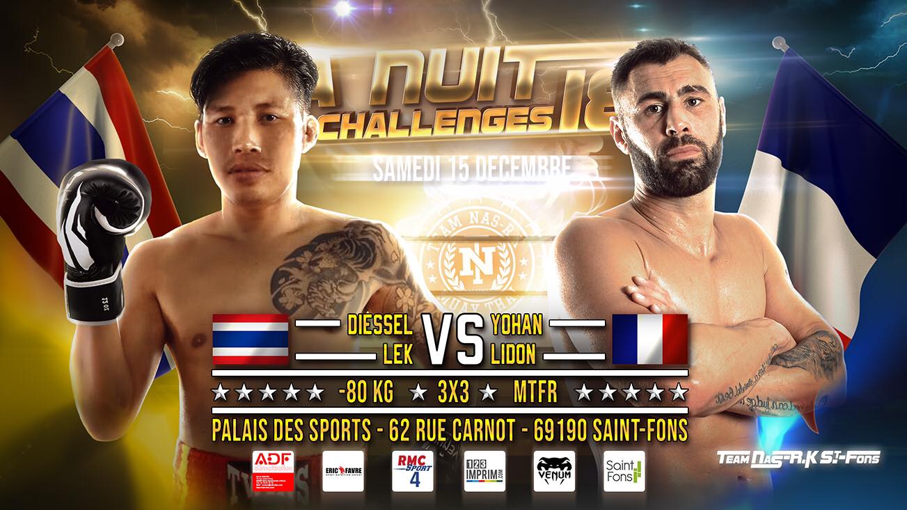 | Muay thai | 3x3mn | -80kg | Yohan Lidon (Fra . 80,100kg) bat Diesellek (Tha . 80kg) aux points | |