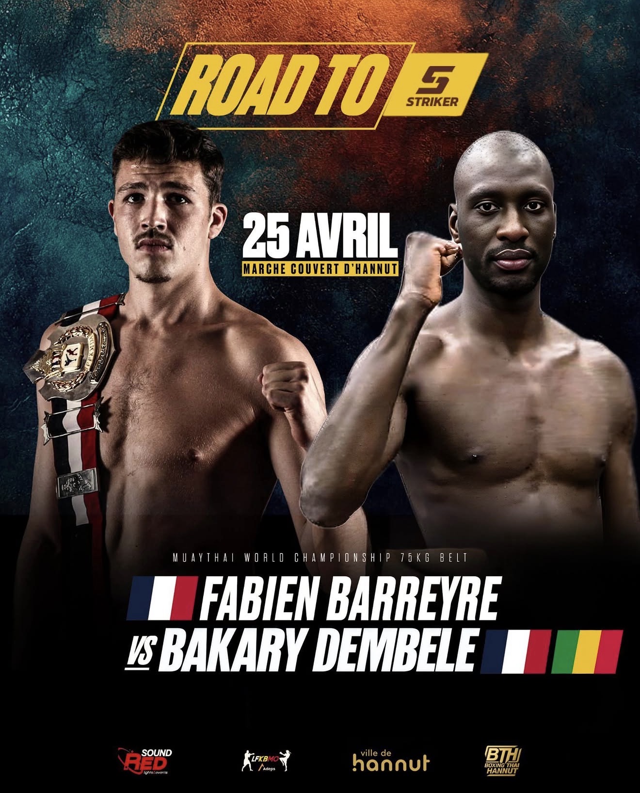 Fabien Bareyre va bien combattre au ROAD TO STRIKER le 25 avril prochain à Hannut (Belgique). Le pensionnaire du Muay-Thai Evolution Bailleul affrontera finalement le franco-malien pour un championnat du monde de muay thai chez les -75 kg. Fabien reste déterminé même s’il n’y gagne pas au change car Bakary est un client sérieux. Pour le nordiste rien ne change : la détermination reste intacte avec une double ambition pour Fabien : renouer avec la victoire et prendre la ceinture. C’est un challenge conséquent mais Fabien aime ces défis-là même si pour cela il lui faudra battre Bakary Dembele, et il va falloir sortir un grand fight face à un grand champion.